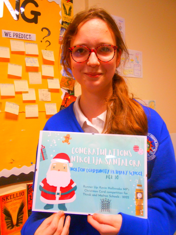 Nikolija, in Mrs Ambrose's class, was a runner up in a prestigious Christmas card competition. Mr Kevin Hollinrake (MP) visited to present her certificate in person.