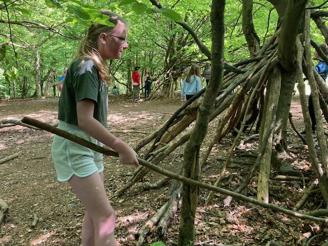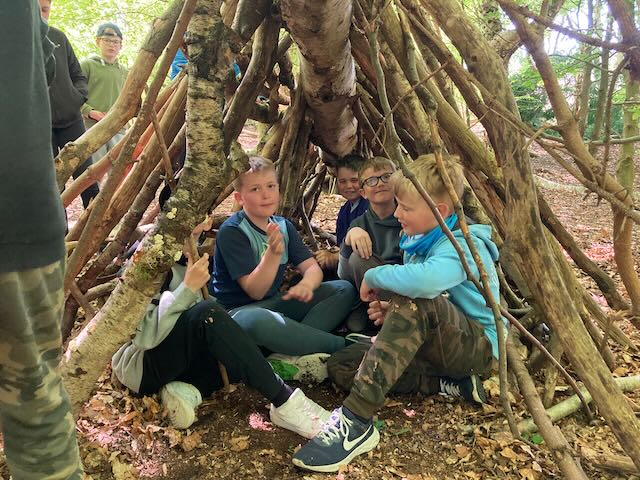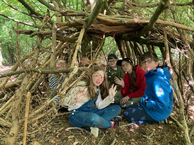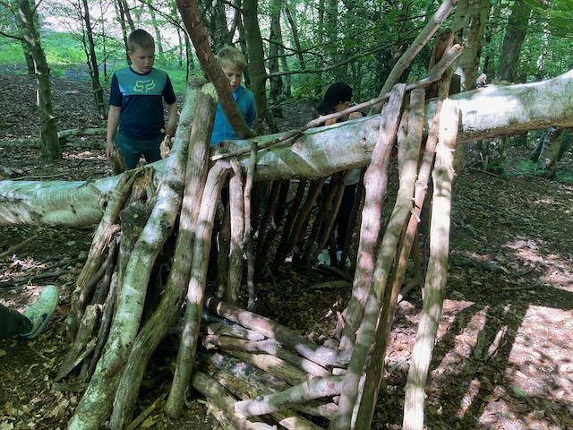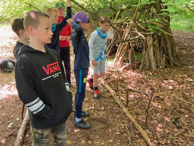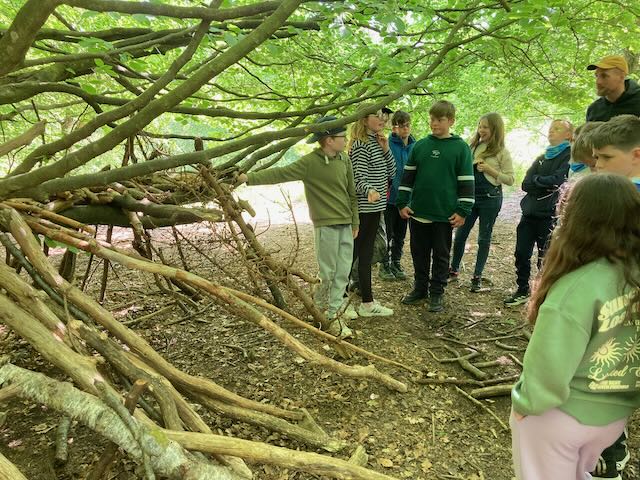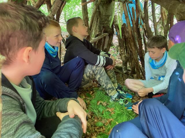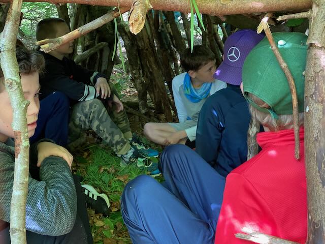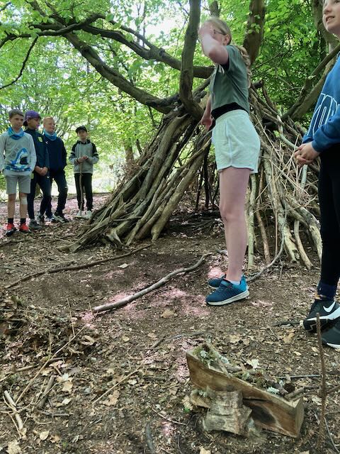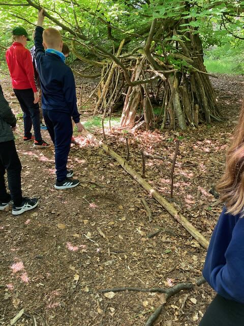 We had a go at shelter building. Each group made a shelter and then presented it to everyone. This involved pointing out all the great features and setting a price in woodland currency (leaves, pine cones, etc.).
