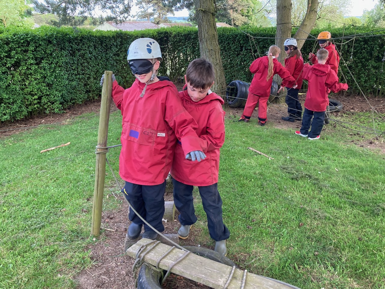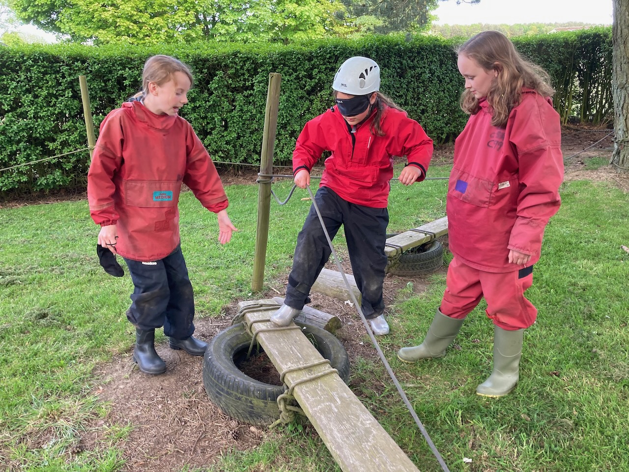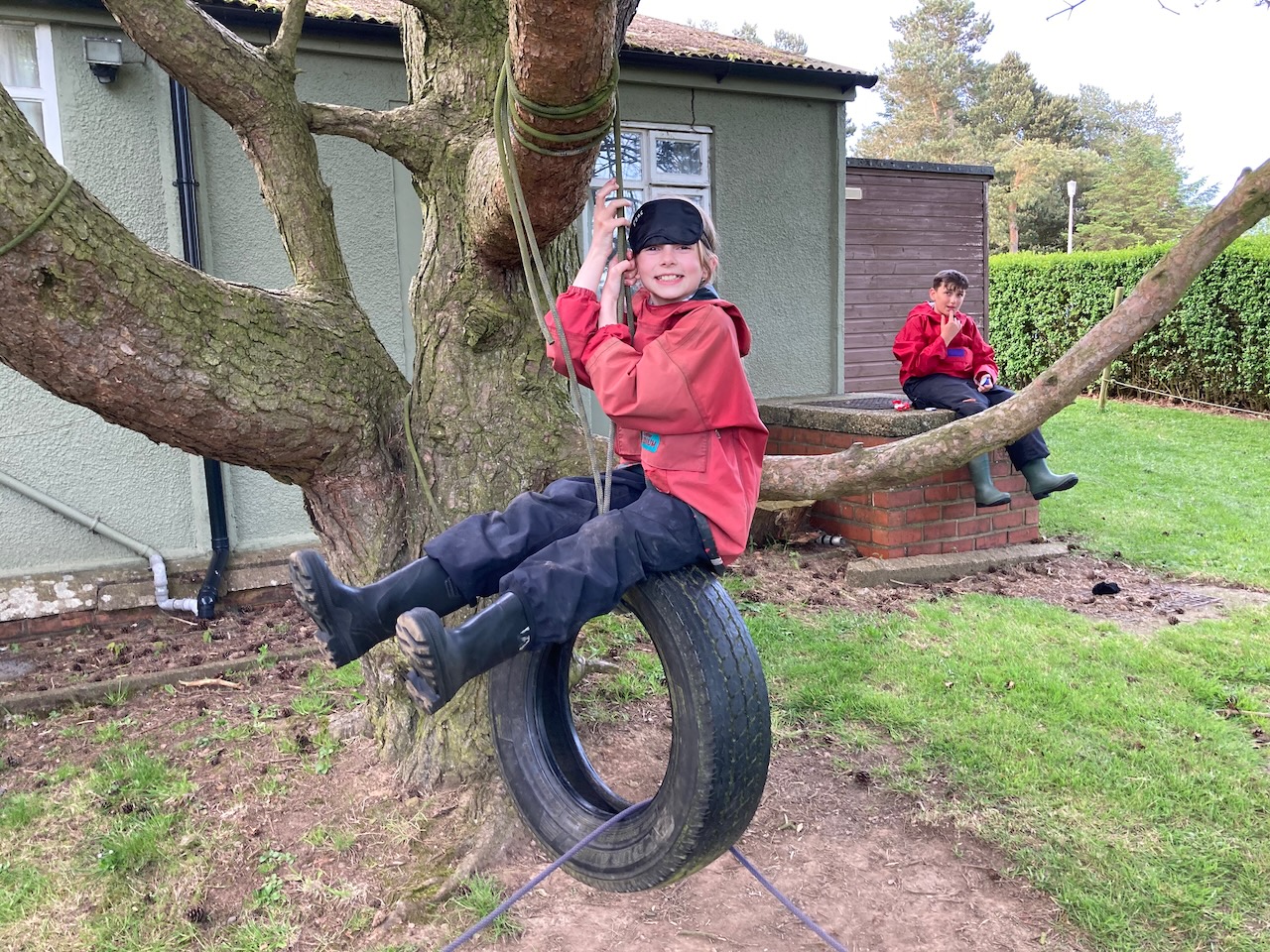 The night line was a difficult challenge to navigate a obstacle course while blindfolded, following a guideline. We worked in teams with a sighted guide and a blindfolded person. The obstacles included; dodging trees, netting and tangle ropes, old tires both on the ground and hanging from trees, a tunnel and planks. Some children fell into a little mud, others got tangled in ropes, but everyone tried hard and managed to complete the course.
