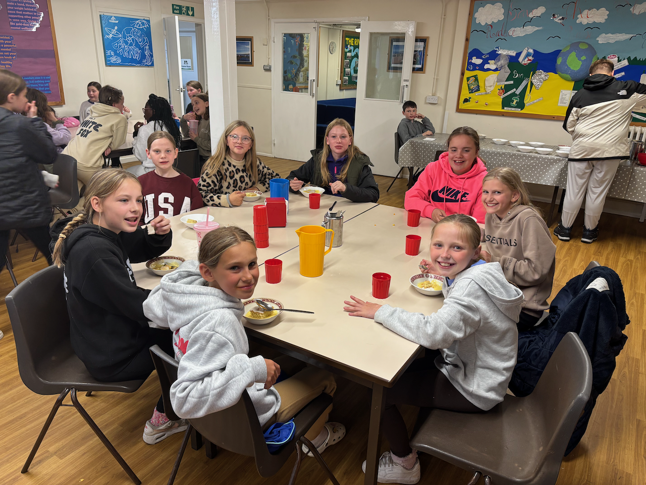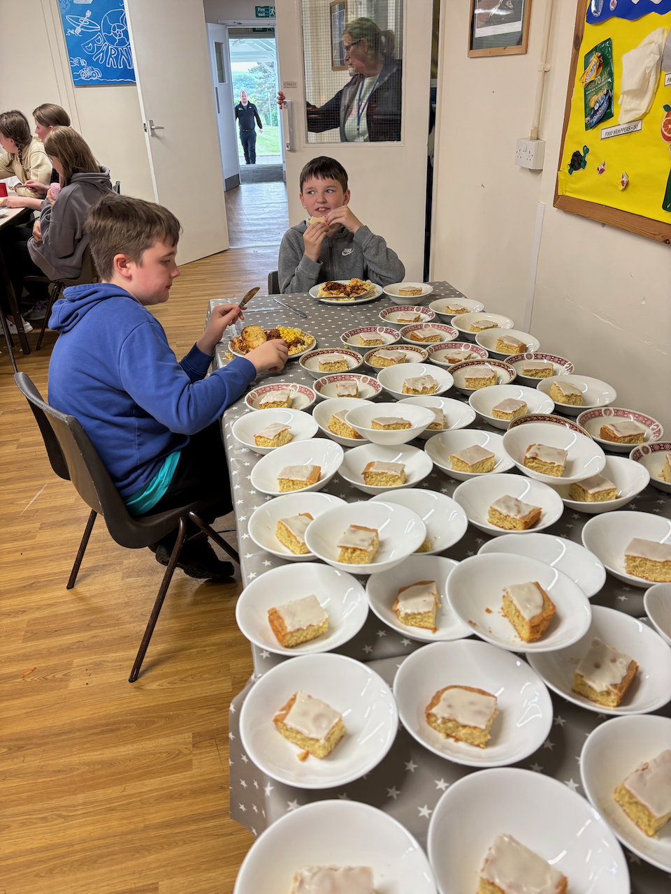 Tea was served at 6PM in the East Barnby canteen. There was a main choice of bolognese sauce or sweet and sour chicken with pasta. There was, however, a slight over catering mistake on the number of spong puddings required. A couple of likely lads offered to eat the surplus.
