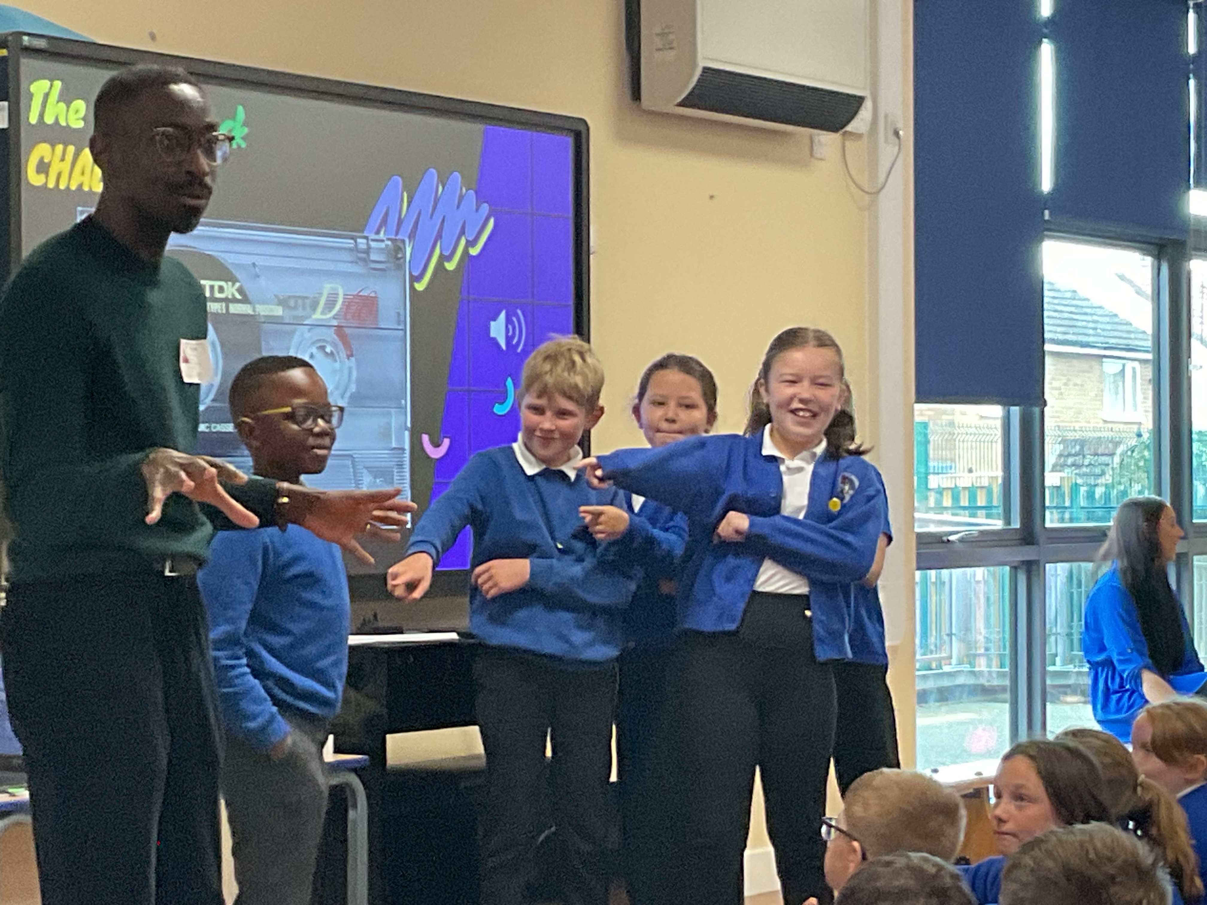 He summarised his books and he let some people come up to the front to act out the stories. He also taught us how to rap and gave us all rap names.